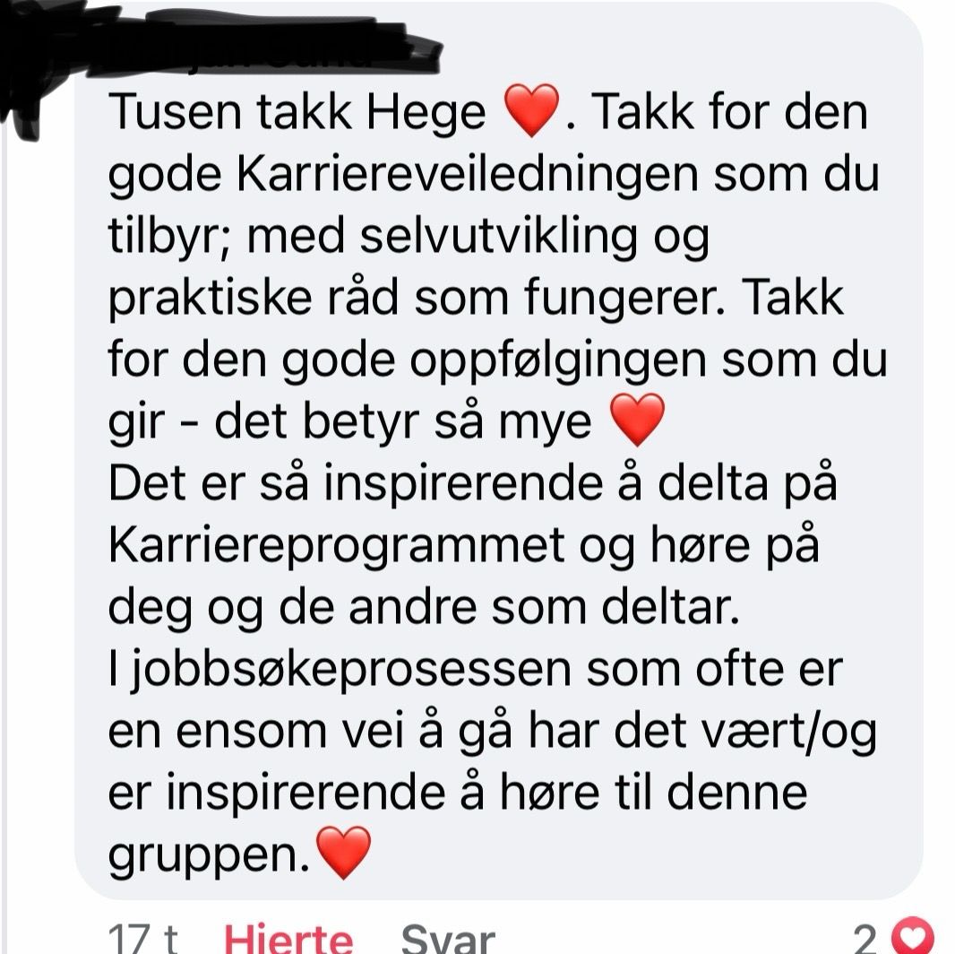 Veiledningen med Hege var over all forventning! Jeg ble mer bevisst pĂ„ hva jeg kan og vil, og jeg er evig takknemlig for Ă„ ha fĂ„tt hjelp til Ă„ se en ny og mer meningsfull karriereveiâ€ïž Anbefaler Hege pĂ„ det varmeste!