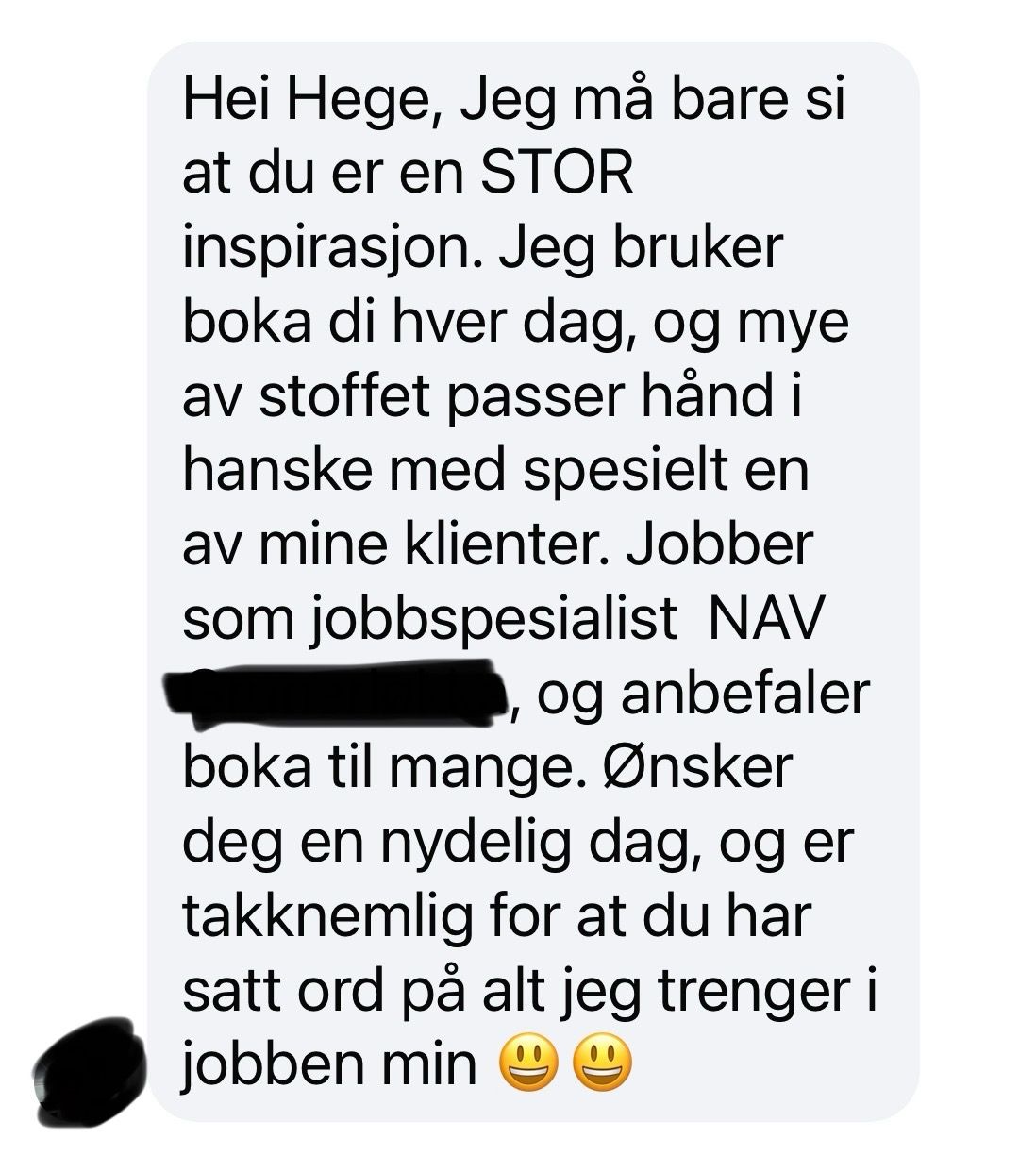 Jeg tok kontakt med Hege etter Ä ha vÊrt utbrent. Med Heges veiledning lÊrte jeg Ä ta bedre vare pÄ meg selv, bÄde fysisk og mentalt. Jeg begynte Ä prioritere det som fÞltes viktig og riktig for meg, og jeg vÄget Ä gÄ for det som bare hadde vÊrt en drÞm sÄ altfor lenge. Resultatet ble ny jobb OG jeg kastet meg ut i ny utdanning!